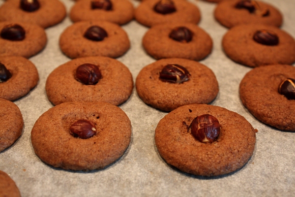 Válečky rozkrájejte na malá kolečka a tvořte z nich placičky (v dlani uválíte kuličku a tu rozmáčknete). Pozor, kolečka opravdu nabydou (skoro 1x tolik), takže je dělejte opravdu maličké. Na vrch dejte vždy polovinu lískového ořechu.