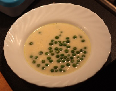 Zalijte vývarem a přidejte hrášek. Vařte, než hrášek změkne (asi 8-10 minut).