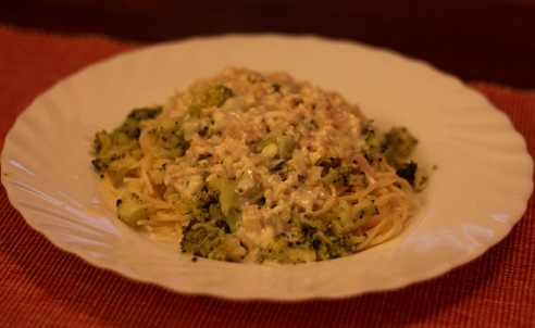 Na talíři vytvořte hromádku špaget, na kterou dejte brokolici a zalije omáčkou.
