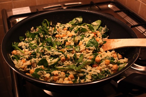 Potom přidáme rýži, cizrnu, rozinky a kešu (a případně rozmražený špenát). Už jen prohřejeme.