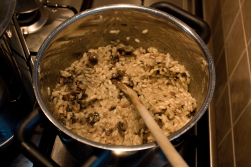 Rýži zalijte jednou naběračkou vývaru a počkejte, až se vsákne. Takhle postupně přilívejte, dokud nebude rýže měkká, ale ne rozvařená (cca 15-20 minut).