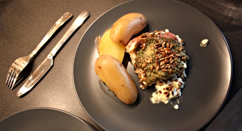 Plátky ryby osolte, opepřete a vložte do zapékací nádoby. Na každý plátek ryby položte plátek šunky, potřete pestem a posypte semínky. Kolem rozlijte smetanu.
