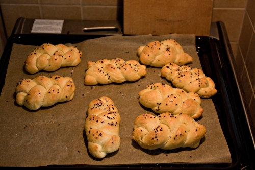 Těsto krátce prohněťte rukama, rozdělte na 12 bochánků, každý z nich potom na 3 kousky. Z těch vyválejte stejně široké proužky a spleťte do houstičky. Houstičky klaďte s dostatečným rozestupem na plech s pečicím papírem a nechte ještě asi 15 minut odpočívat a kynout.