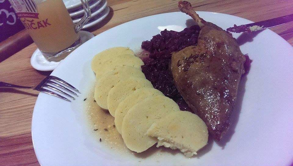 Jídelní lístek je sympaticky štíhlý a klasickou hospodskou nabídku hází do nového kabátku. Menu navíc využívá lokální suroviny jako z rybárny v Anníně nebo sýrové farmy Melcher. Tu klasiku trochu zvláštně doplňují jídla, která bych hledala úplně někde jinde (jako caesar nebo kuřecí prso marinované v citronové trávě a koriandru), ale neměla jsem, tak nehodnotím, jestli je umí. Vepřové koleno na pivě tedy umí. Krásně šťavnaté maso doplnily pečené brambory, do křupava grilovaná zelenina a redukce. Kachně by slušelo o něco výraznější dochucení, ale zelí bylo správně kyselé.