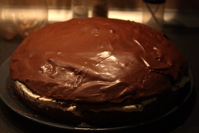 Čokoládu nalámejte do smetany a postupně zahřívejte, až bude čokoláda rozpuštěná. Nalijte na korpus a opět nechte alespoň hodinu odpočinout v chladu.