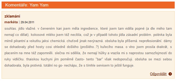Z obsluhy jsem byla celkem rozpačitá. Pití nám přinesli až po předkrmu a jídlo naopak už během předkrmu. Potom zase byly prostoje s doobjednáním pití.