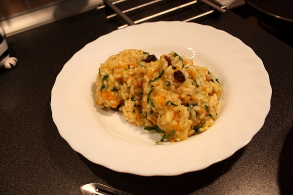Potom přidáme rýži, cizrnu, rozinky a kešu (a případně rozmražený špenát). Už jen prohřejeme.